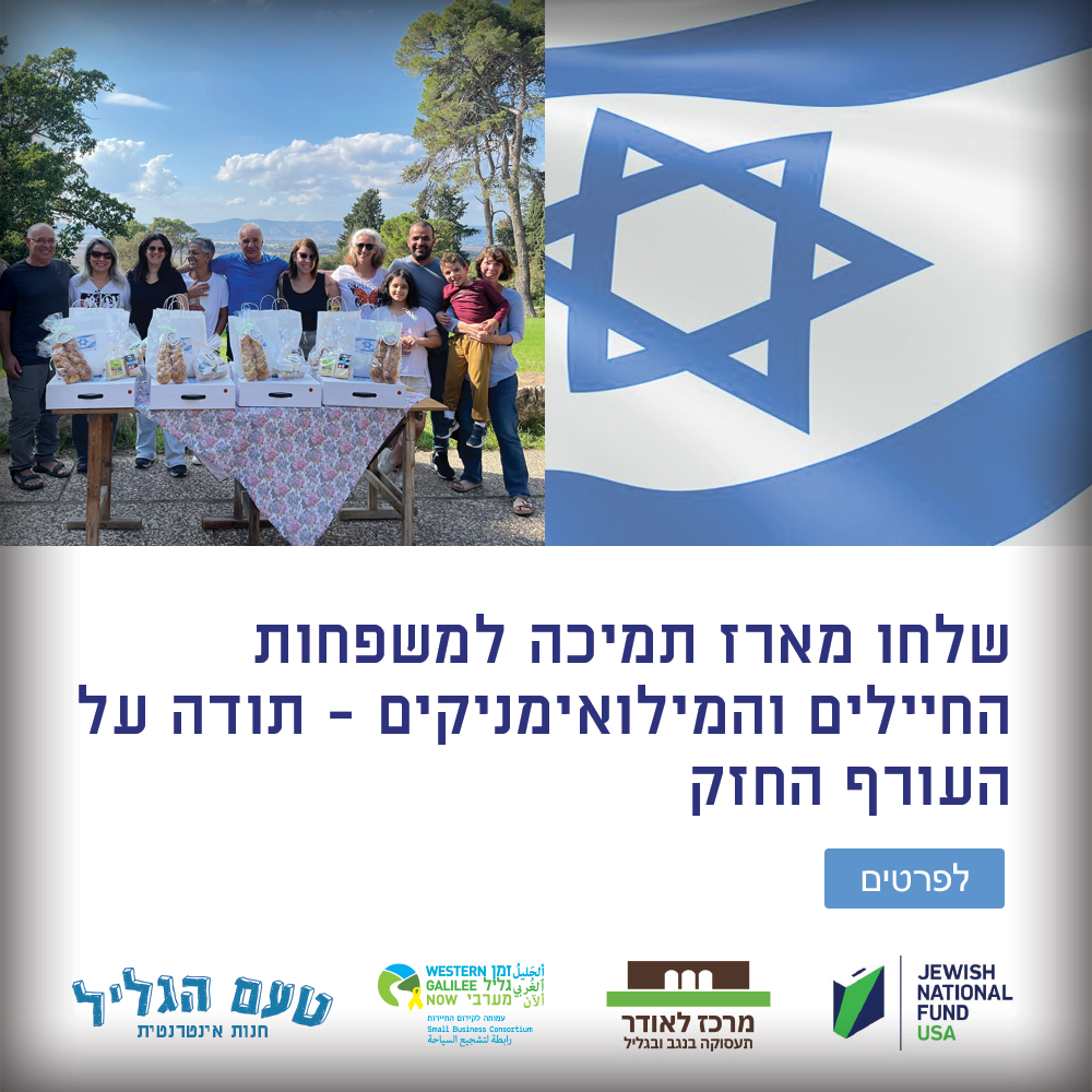 שלחו מארז תמיכה למשפחות החיילים והמילואימניקים ואחנו נדאג להעביר אותה אליהם. נרכיב חבילה מלאה בבריאות ואהבה שתעודד ותנחם אותם בזמנים הקשים האלה.